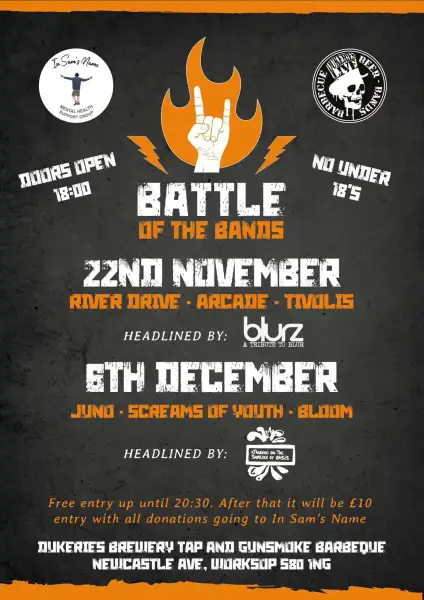 Battle of the Bands will take place on the following dates with the artists battling it out with top headliners Blurz (A Tribute to Blur) and Standing on the Shoulder of Oasis (Oasis tribute). THe Doors at The Dukeries Tap, Worksop will open at 18.00 with free entry upto 20.30 then £10 entry after with all donations going to In Sam's Name.